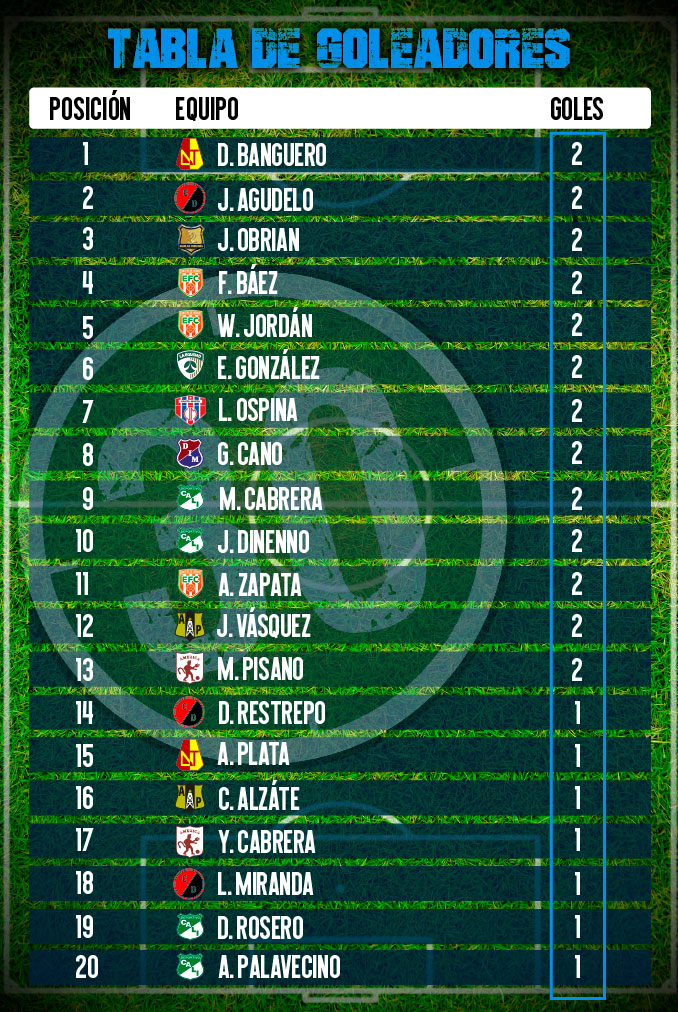 En él aparecen tres representantes de Envigado Fútbol Club; Jaáder Obrian, de Rionegro Águilas Doradas; y Germán Ezequiel Cano, de Independiente Medellín, quien se bien no comenzó la Liga con la frecuencia anotadora de otros torneos, se mantiene en la pelea.
