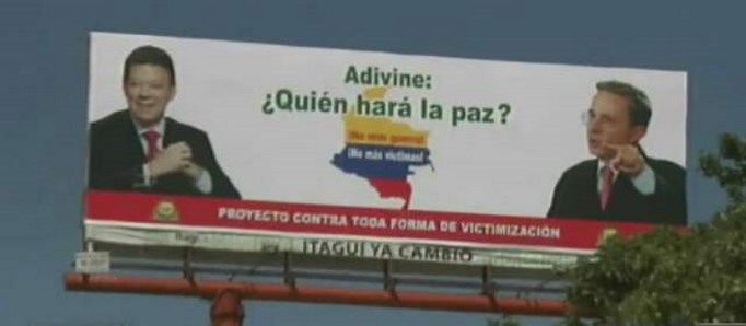 En medio de ambos se encontraba la expresión “adivine: ¿quién hará la paz?” y un mapa con los colores de la bandera de Colombia con la frase “no más guerra, no más víctimas”. Finalmente, en la parte inferior, sobre una franja roja se leía: “proyecto contra toda forma de victimización”.La pieza publicitaria se encontraba en la Autopista Sur a la altura de la quebrada La María.