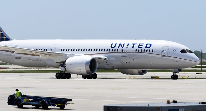 Vista de un modelo Boeing 787 Dreamliner operado por la aerolínea United Airlines