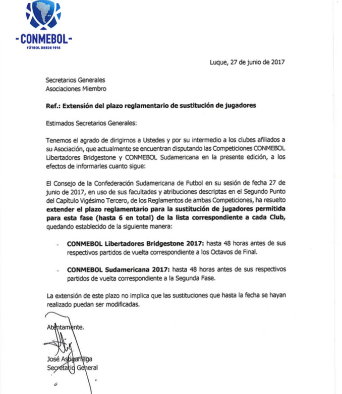 El Consejo de la Conmebol resolvió extender el plazo reglamentario para la sustitución de jugadores permitida para esta fase de Libertadores y Sudamericana (hasta 6 en total), de la lista correspondiente a cada club.