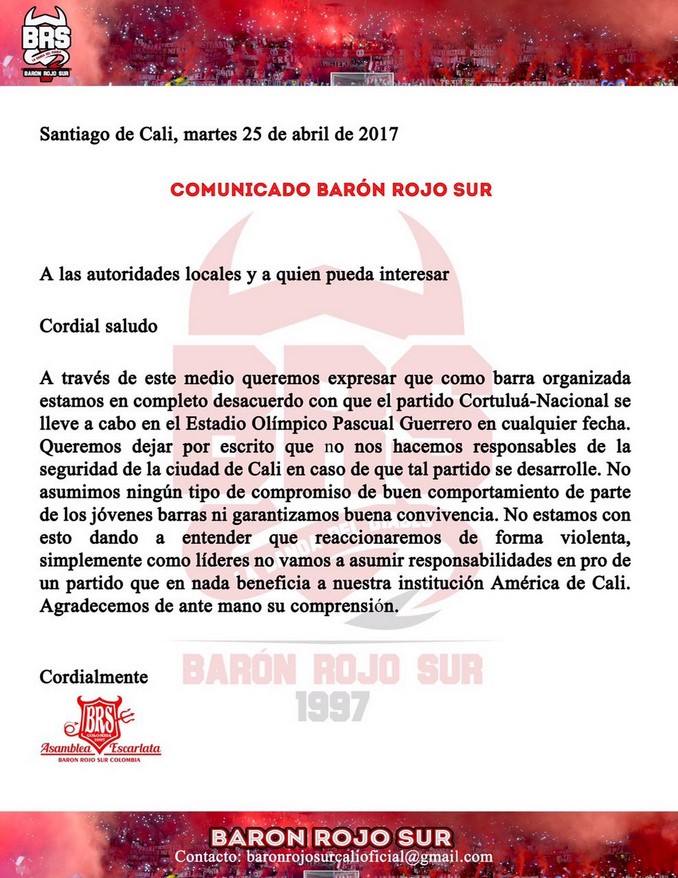 Un polémico comunicado emitió en las últimas horas la barra ‘Barón Rojo’ del América de Cali.
