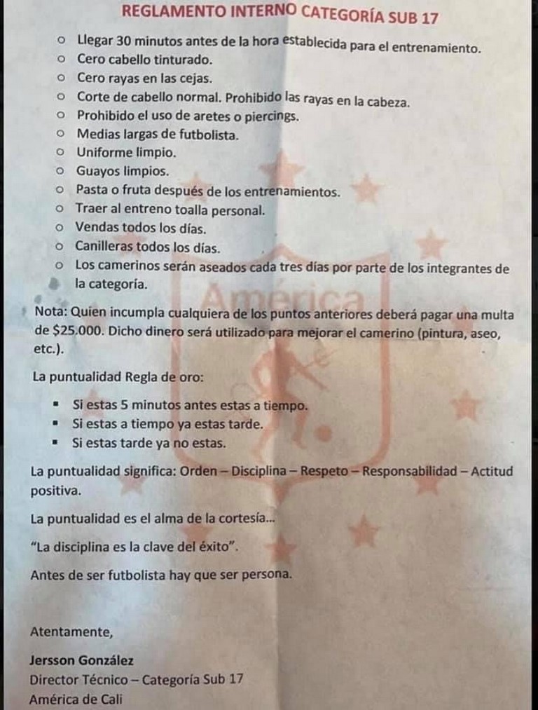 Así es el reglamento interno de Jerson González en divisiones menores del América de Cali