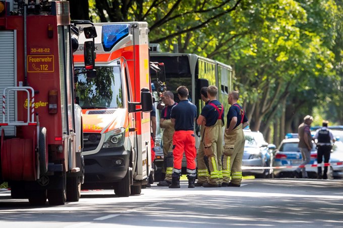 Efectivos de equipos de emergencia trabajan en el lugar donde doce personas resultaron heridas, dos de ellas de gravedad, en un ataque cometido por un hombre armado con un cuchillo en un autobús urbano, en la ciudad alemana de Lübeck, el 20 de julio del 2018. EFE