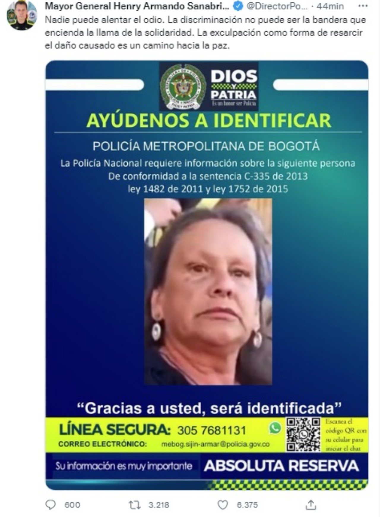 El Director General de la Policía Nacional de Colombia, el Mayor General Henry Armando Sanabria Cely, publicó en su cuenta de Twitter el cartel de se busca.