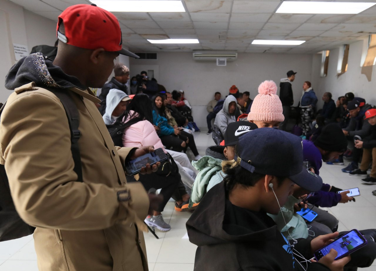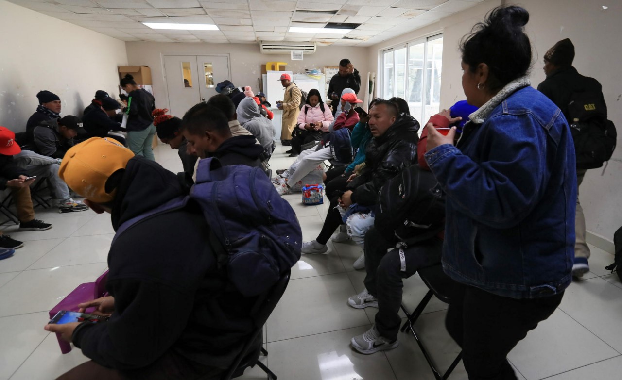 -Un grupo de migrantes, revisan su celular hoy en el comedor de la catedral en la fronteriza Ciudad Juárez, Chihuahua (México).Migrantes y autoridades eclesiásticas de la mexicana Ciudad Juárez, denunciaron que, de forma arbitraria, elementos de la policía pública municipal, entraron a la catedral y retiraron con violencia a migrantes que estaban dentro de un comedor, dejando a al menos uno de ellos herido. EFE/Luis Torres