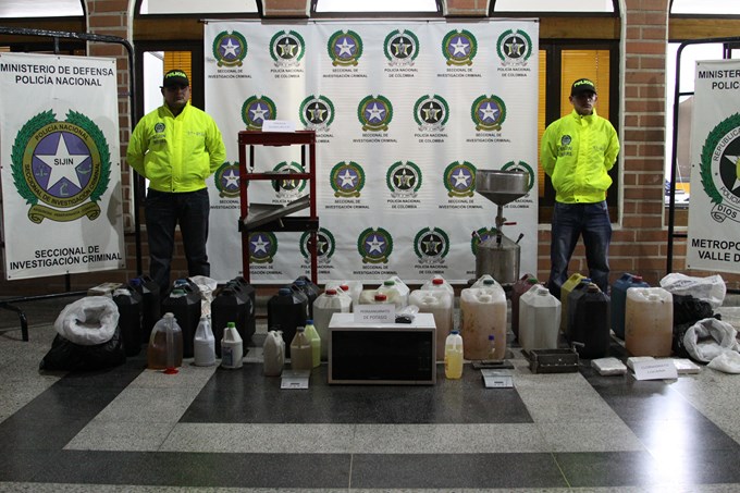 Se trataba de una edificación rústica, en madera y plástico, en la que fueron incautados 2.863 kilos de permanganato de potasio, 125 kilos de hidróxido de potasio, 84 canecas plásticas con precursores líquidos, 125 kilos de soda caustica, 2 planchas de secado y 2 pipetas de gas.