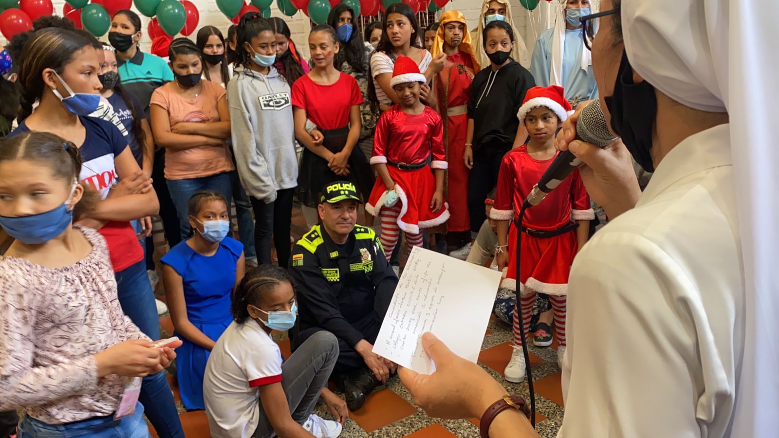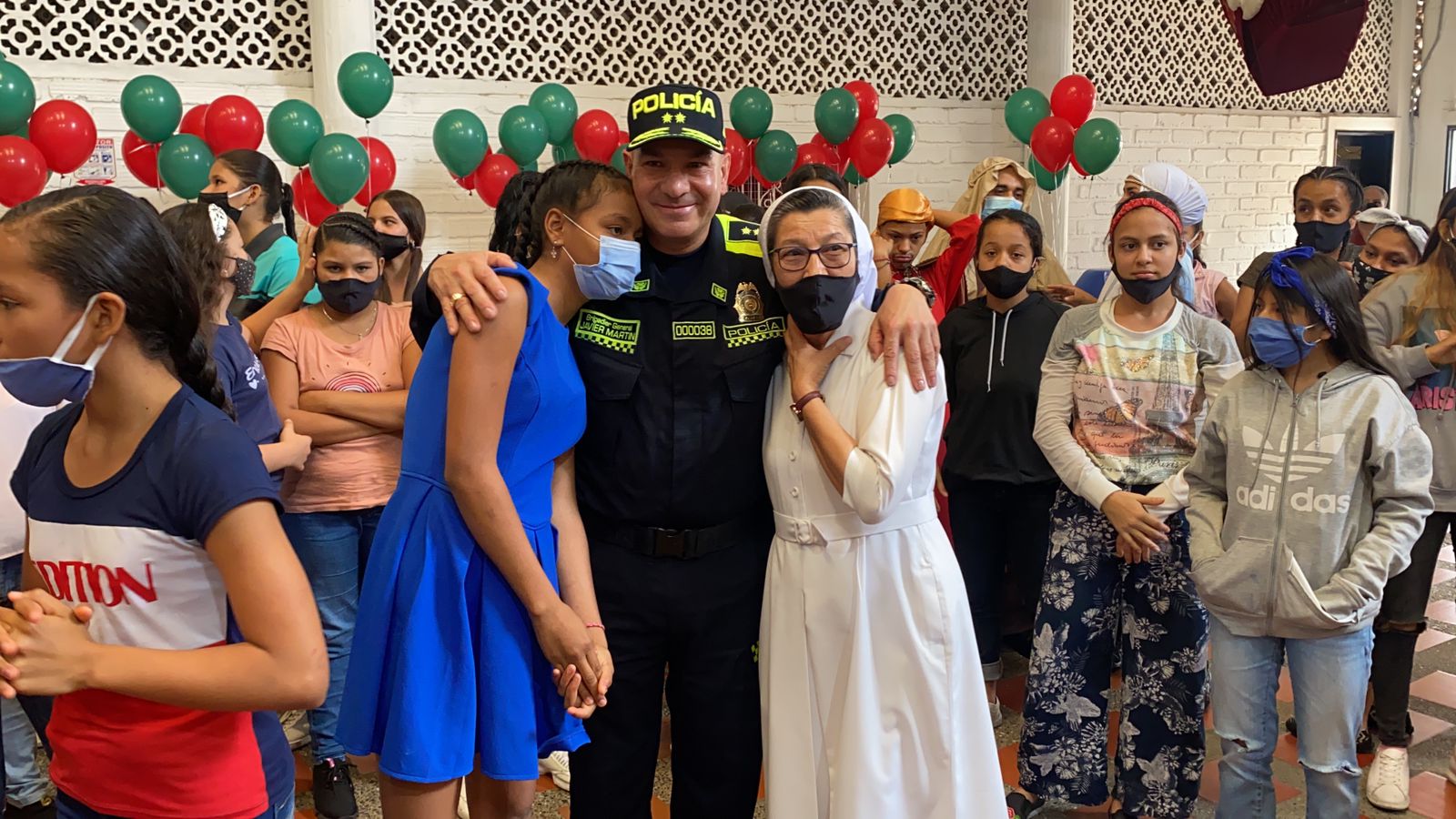 Con los ojos ‘encharcados’, el brigadier general Javier Josué Martín, comandante de la Policía Metropolitana del Valle de Aburrá, contó, “son niñas con diferentes problemas, víctimas de violencia, en estado de abandono, tratando de recuperar sus derechos (…) llegamos acá a traer un poco de alegría a traerle unos regalos a unas niñas a darles una voz de aliento a integrarnos”.