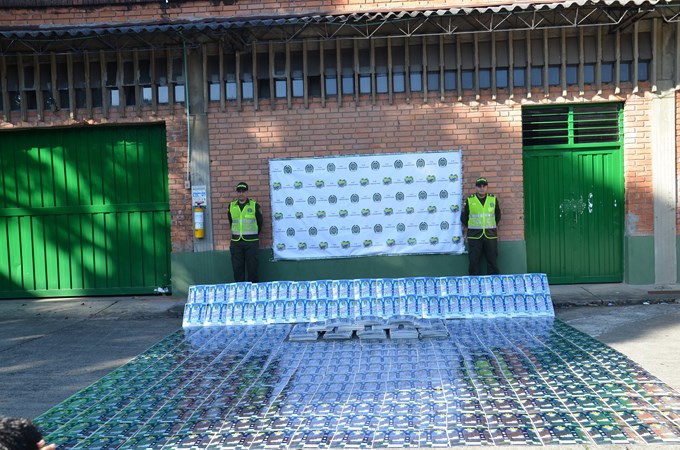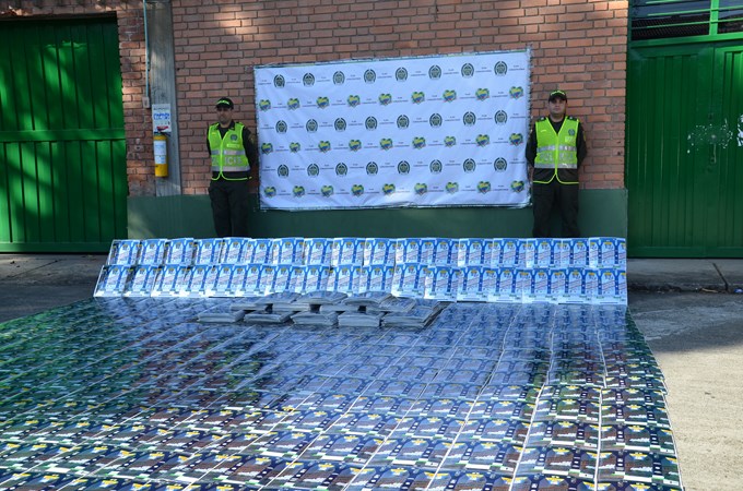 Al realizar la inspección de contenidos, las unidades policiales encontraron que en el interior de la caja estaban perfectamente empacadas 1.000 cajas tetra pack falsificadas con los emblemas de aguardiente de una de las principales industrias licoreras colombianas.