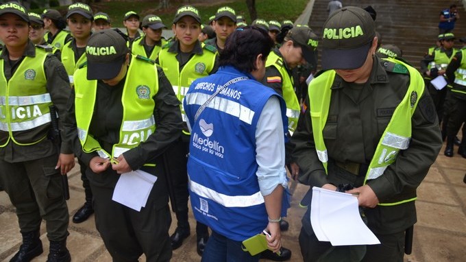 Personal de derechos humanos de la Personería de Medellín verifica que el personal no porte armas de fuego, y que el accionar de la institución sea en el marco del respeto de los derechos humanos de los ciudadanos.