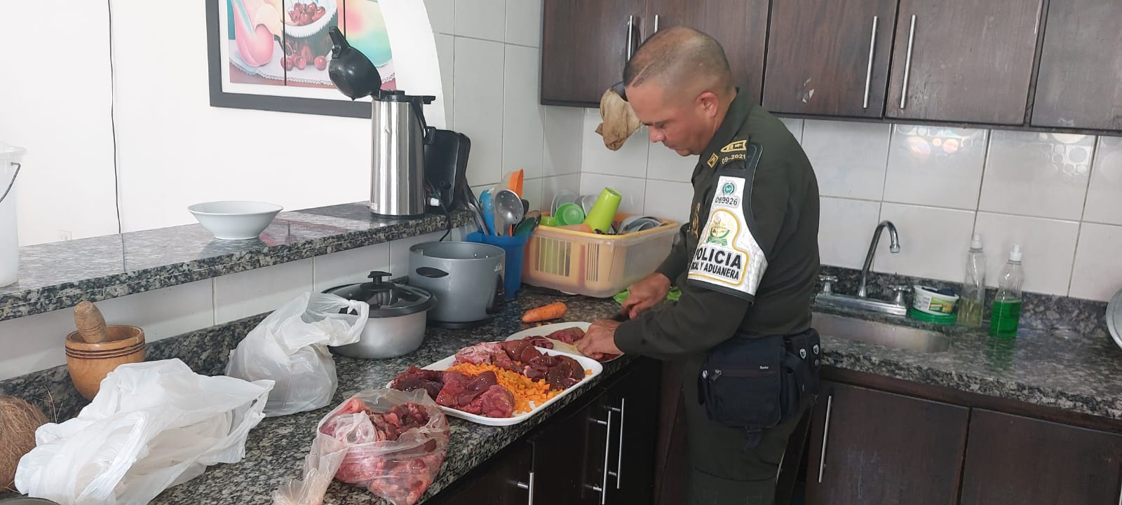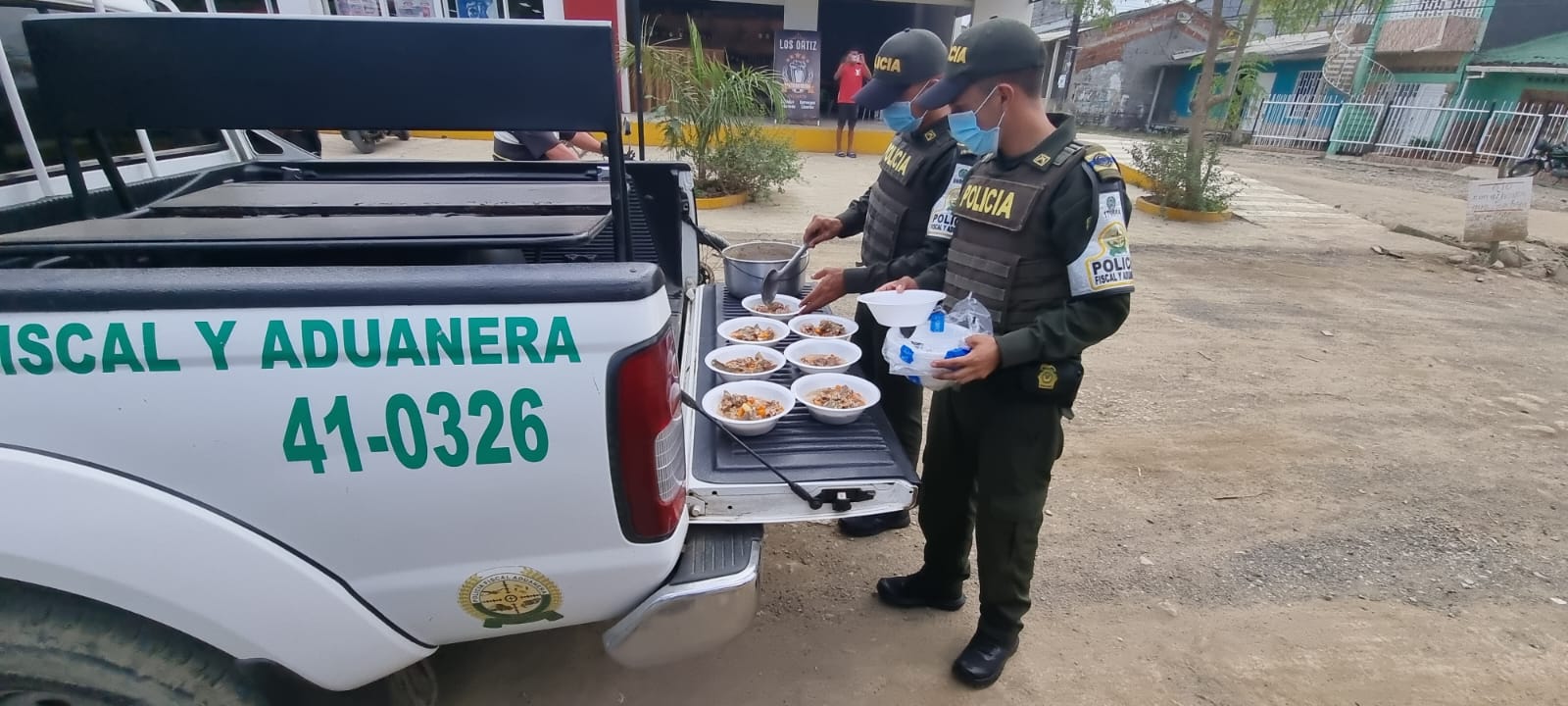 Las imágenes muestran que los uniformados, con sus propias manos, prepararon los alimentos y las porciones que le iban a dar a cada perrito y luego, utilizaron la patrulla de la Institución para la hermosa causa.