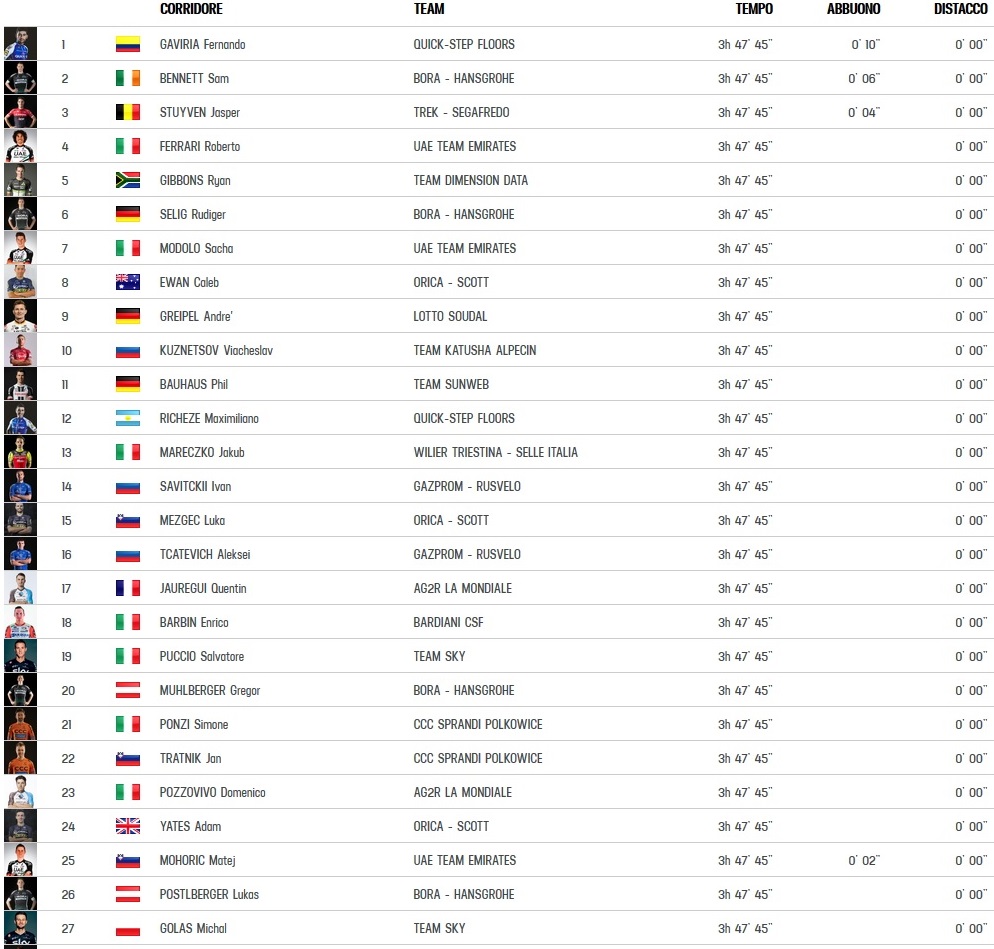 No apareció en escena el alemán André Greipel (Lotto Soudal). Se estrenó en la primera etapa y luego entró en el camino oscuro de chocar una y otra vez contra el muro del barbudo Gaviria, quien ha rentabilizado la inversión de sus padres y hermana por ir a verle al Giro. No ganan para fuertes y agradables emociones.