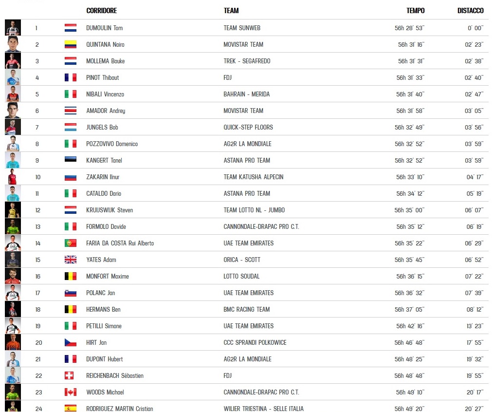 Los favoritos a lo suyo, que es esperar sin incidentes su momento, que llega este sábado con el ascenso a Oropa, tercera llegada en alto del Giro. Dumoulin defenderá el maillot rosa con su cómoda ventaja: 2.23 minutos sobre Nairo Quintana, 2.38 a Bauke Mollema, 2.40 a Thibaut Pinot y 2.47 a Vincenzo Nibali.