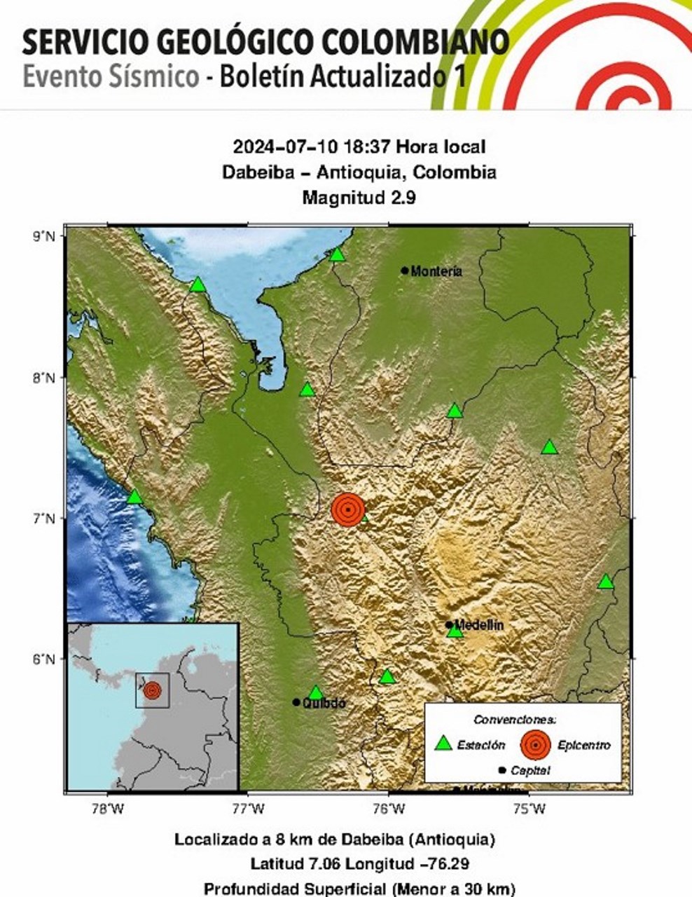 A las 6:37 de la noche, hora local, un sismo de magnitud 2.9 fue registrado por los sismógrafos del Servicio Geológico de Colombia.