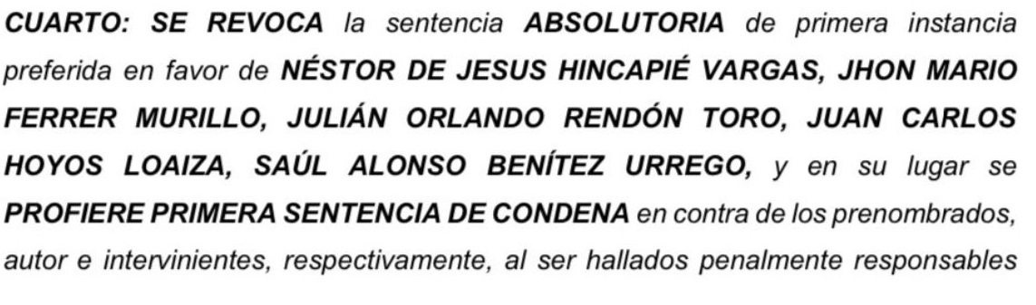 La revocatoria del fallo proferido por un juez en primera instancia, que lo había exonerado, también afecta a Jhon Mario Ferrer Murillo, Julián Orlando Rendón Toro, Juan Carlos Hoyos Loaiza y Saúl Alonso Benítez Urrego.