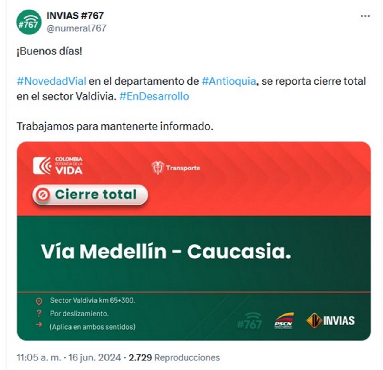Resumen: Cierre de la vía Medellín Caucasia por deslizamiento. Derrumbe en Valdivia, km 65+300. Cierre en ambos sentidos sin ruta alterna. Autoridades trabajan en restablecer la movilidad.
