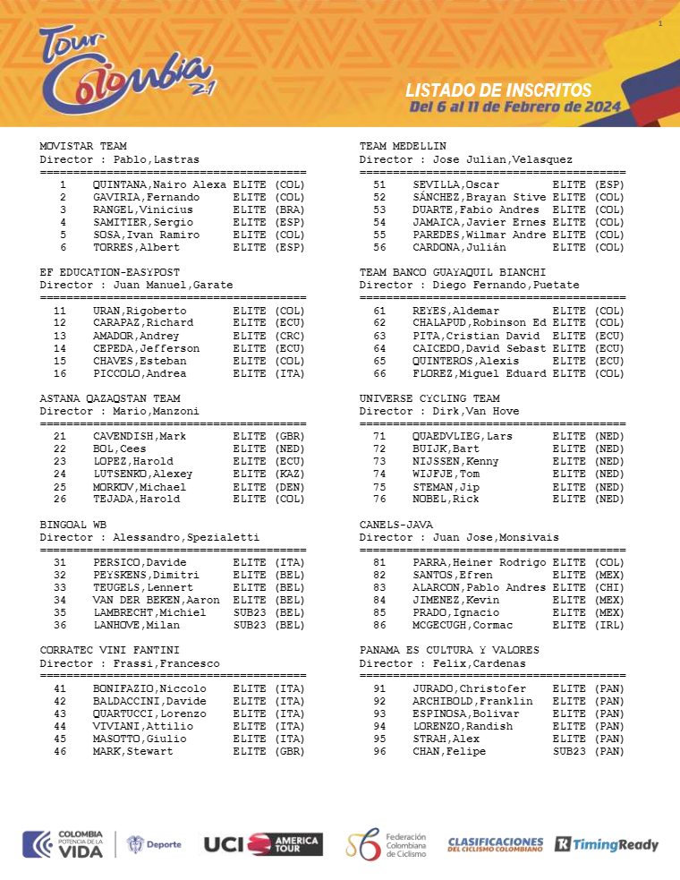 Acá el listado completo de los corredores del Tour Colombia 2024.