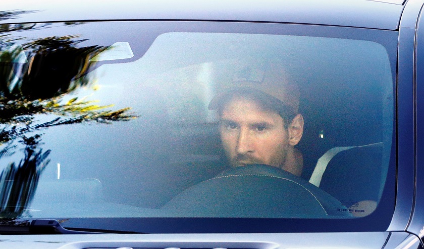 El delantero del Barcelona Lionel Messi a su llegada a la Ciudad Deportiva Joan Gamper par empezar la pretemporada con el conjunto azulgrana, después de que el pasado viernes anunciara su decisión de cumplir finalmente el año que le queda de contrato. EFE/Alejandro Garcia
