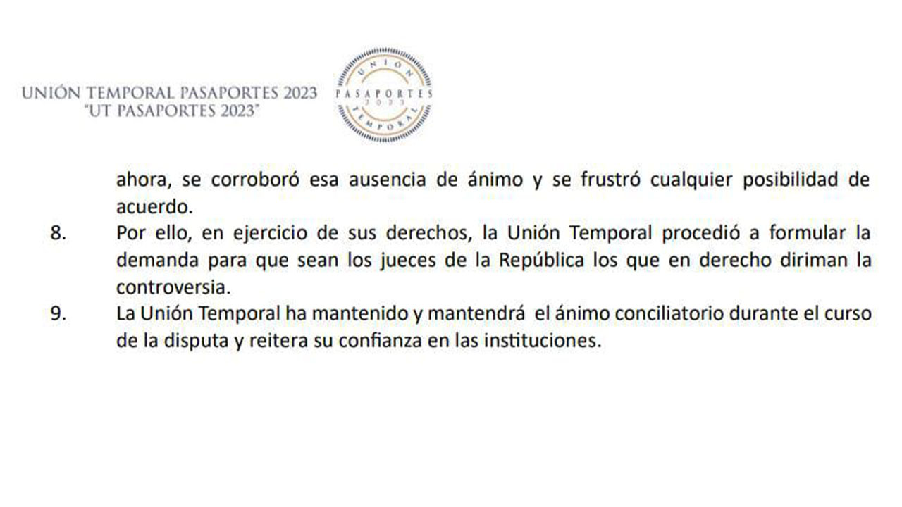 Despues de esto la empresa dijo que “Por ello, en ejercicio de sus derechos, la Unión Temporal procedió a formular la demanda para que sean los jueces de la República los que en derecho diriman la controversia. La Unión Temporal ha mantenido y mantendrá el ánimo conciliatorio durante el curso de la disputa y reitera su confianza en las instituciones”, indicó Thomas Greg en el comunicado.