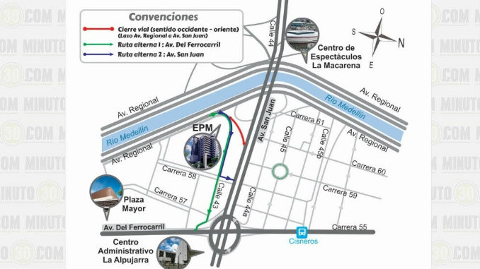 Minuto30.com- Para continuar con el traslado de redes de servicios públicos domiciliarios, obras adelantadas por EPM y requeridas en el proyecto Parques del Río, es necesario realizar el cierre total del tramo que comunica a la Avenida Regional con la Avenida San Juan (hacia el oriente), a partir del miércoles 25 de octubre desde las 10:00 a.m., hasta el jueves 9 de noviembre a las 4:00 a.m., según lo dio a conocer la Secretaría de Movilidad de Medellín.