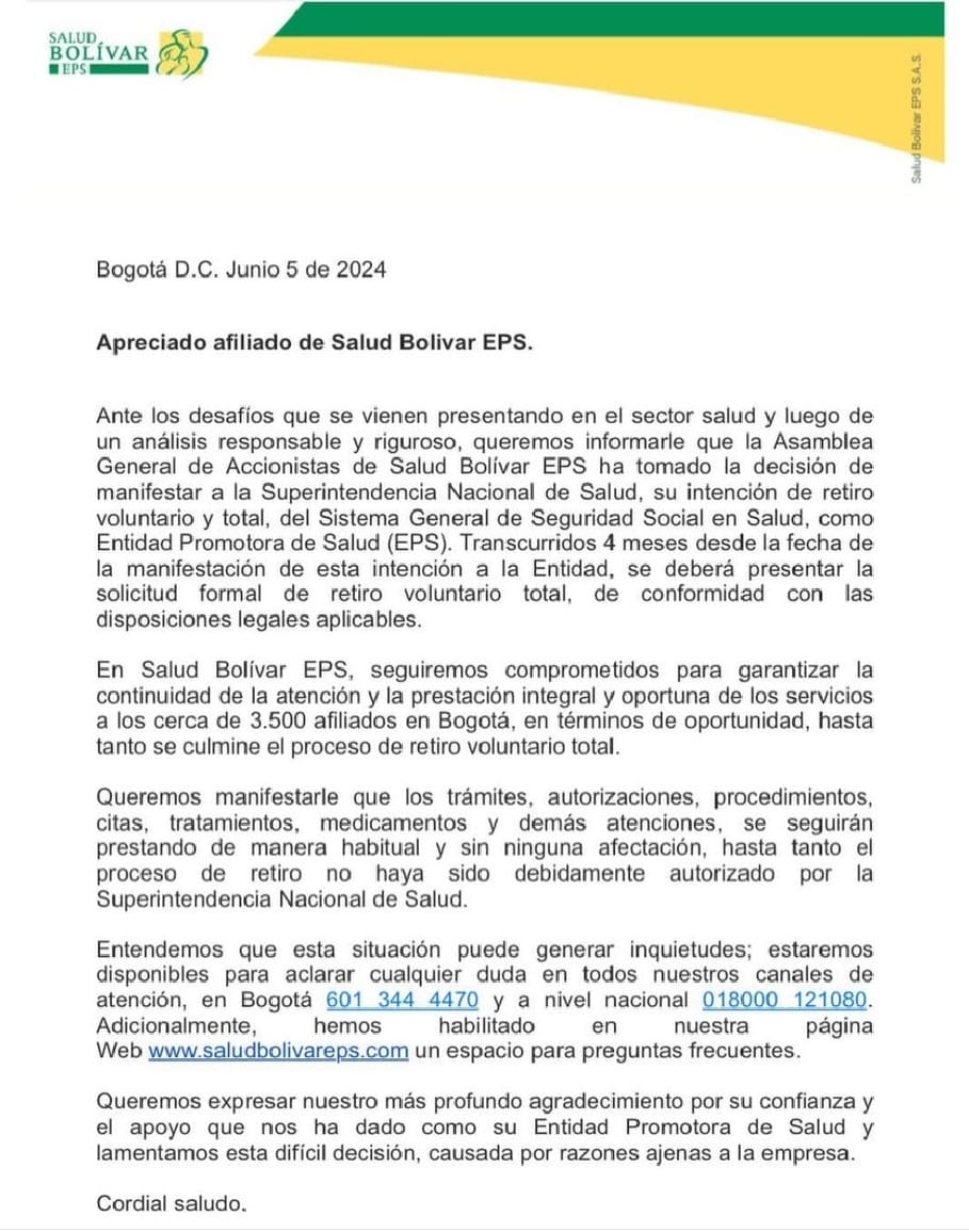 Resumen: EPS Salud Bolívar solicita autorización a la Superintendencia Nacional de Salud para iniciar el proceso de retiro voluntario del Sistema de Salud debido a problemas financieros. La entidad se compromete a garantizar la continuidad de la atención a sus afiliados hasta que se efectúe el traslado a otra prestadora, tras una respuesta positiva de la Superintendencia.