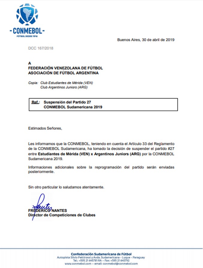 La Confederación Sudamericana de Fútbol (Conmebol) decidió suspender el partido que se disputa por la primera vuelta de la Copa Sudamericana entre Estudiantes de Mérida de Venezuela y Argentinos Juniors, el cual estaba programado para jugarse el próximo jueves a las 3 pm, hora colombiana, esto debido a la delicada situación que se vive en Venezuela.