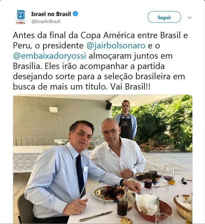 “Antes de la final de la Copa América entre Brasil y Perú, el presidente @jairbolsonaro y @embaixadoryossi almorzaron juntos en Brasilia y seguirán el juego, deseándole suerte al equipo brasileño en busca de otro título. ¡¡Vamos Brasil!!”, decía el tweet, difundido por la cuenta oficial de la Embajada israelí.