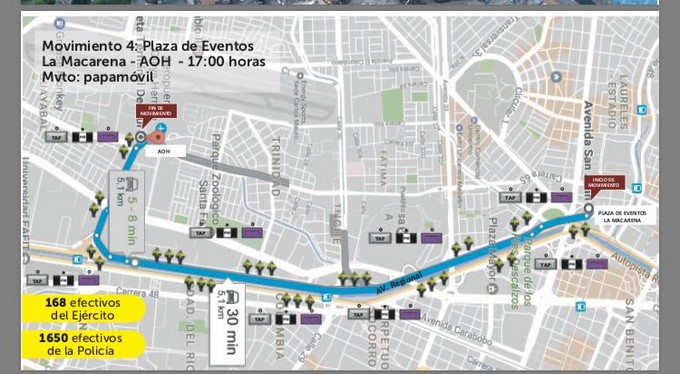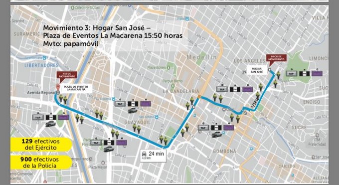 Más de mil personas hacen parte de la logística para recibir al santo papa, los ciudadanos tendrán tres momentos en los cuales podrán ver al máximo jerarca de la iglesia católica, uno es la misa campal en el aeropuerto Olaya Herrera y dos recorridos que hará en el Papa móvil, hasta el hogar San José y el Seminario.