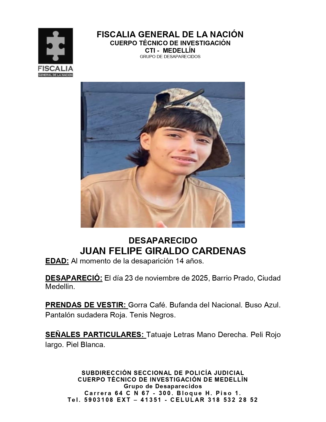Minuto30.com .- Se solicita la colaboración de la ciudadanía para encontrar a Juan Felipe Giraldo Cárdenas, un menor de 14 años de edad, cuyo rastro se perdió el pasado 23 de noviembre de 2025 en el barrio Prado de Medellín. Sus familiares están en angustiosa búsqueda y han emitido una alerta oficial.