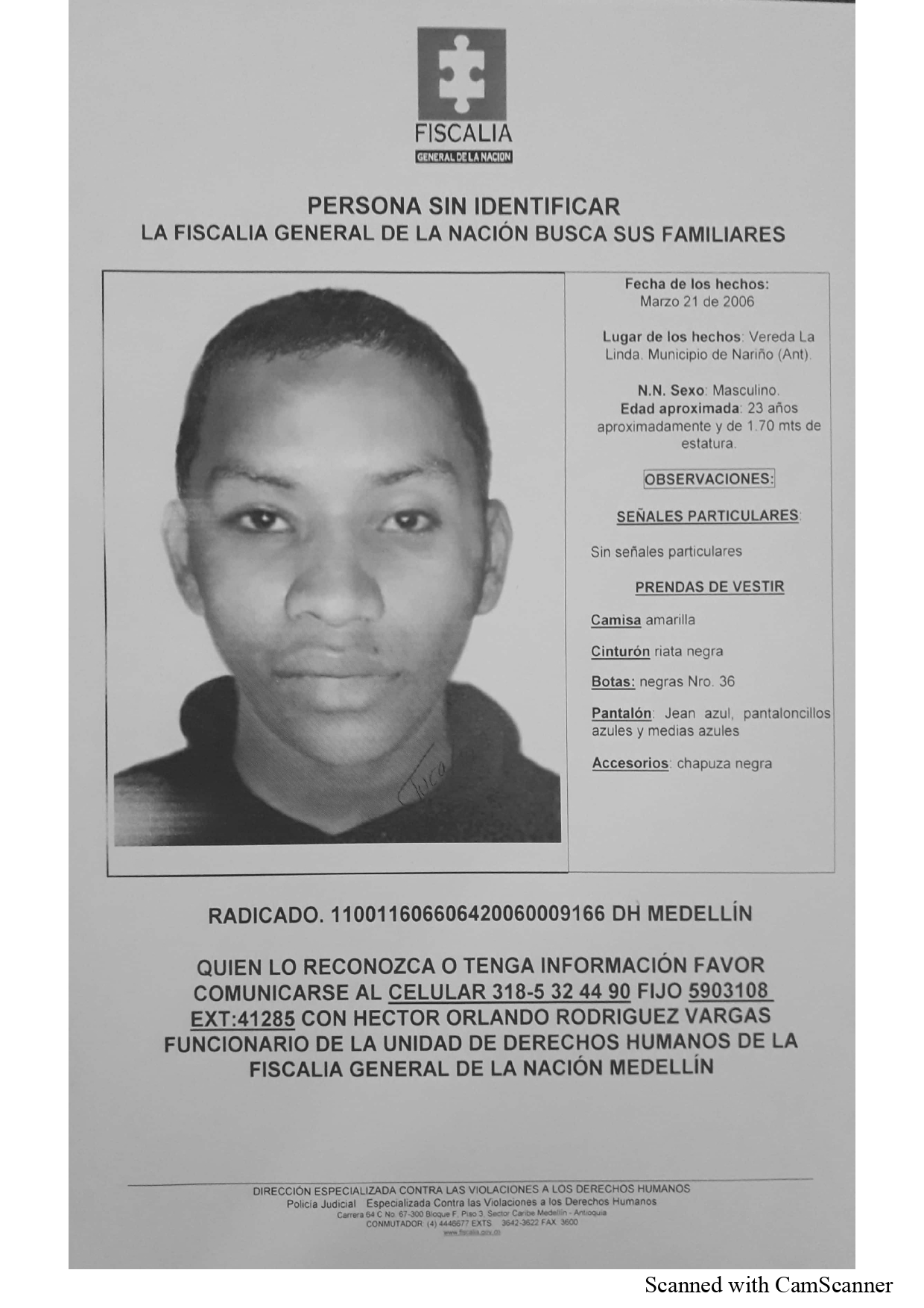 Si alguien lo reconoce, comunicarse con la fiscalía – Dirección Especializada Contra las Violaciones a los Derechos Humanos – Seccional Medellín– al teléfono 5903108 ext 41285 o al celular 3185324490.