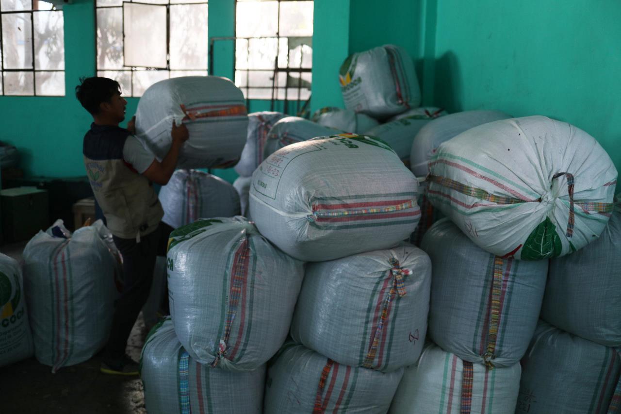 Un joven carga apila costales de coca en el mercado de coca, el 02 de junio de 2023, en La Paz (Bolivia). EFE/Luis Gandarillas