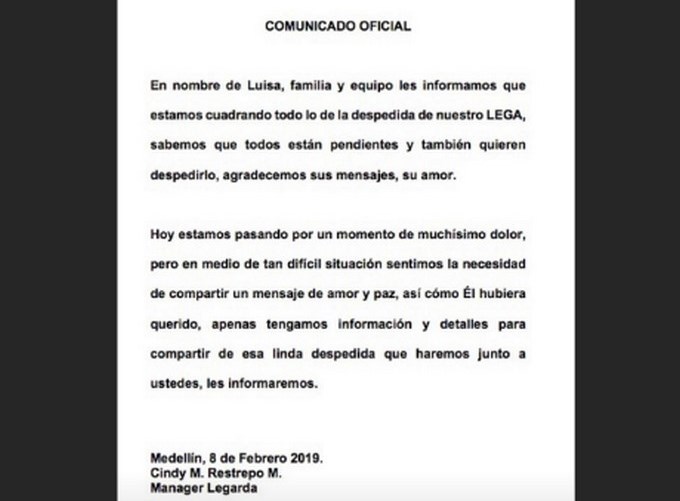 Después del fallecimiento del cantante Legarda, tras recibir un disparo durante un fleteo en el barrio el Poblado y en el que la víctima respondió a los delincuentes con tiros, Luisa Fernanda W y el equipo de trabajo del cantante publicaron un comunicado oficial.
