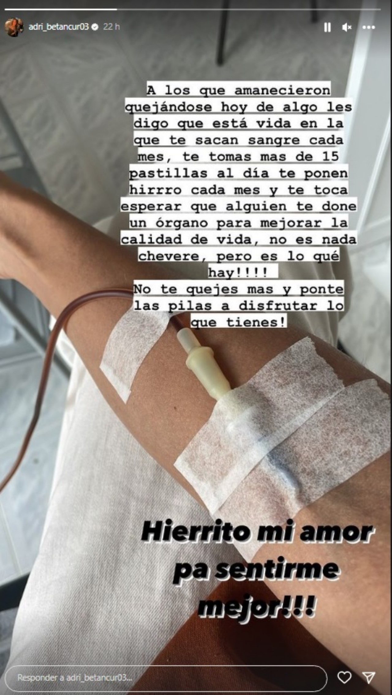 “A los que amanecieron quejándose hoy de algo les digo que está vida en la que te sacan sangre cada mes, te tomas más de 15 pastillas al día, te ponen hierro cada mes y te toca esperar que alguien te done un órgano para mejorar la calidad de vida, no es nada chévere, pero es lo que hay!!!!, No te quejes más y ponte las pilas a disfrutar lo que tienes.”