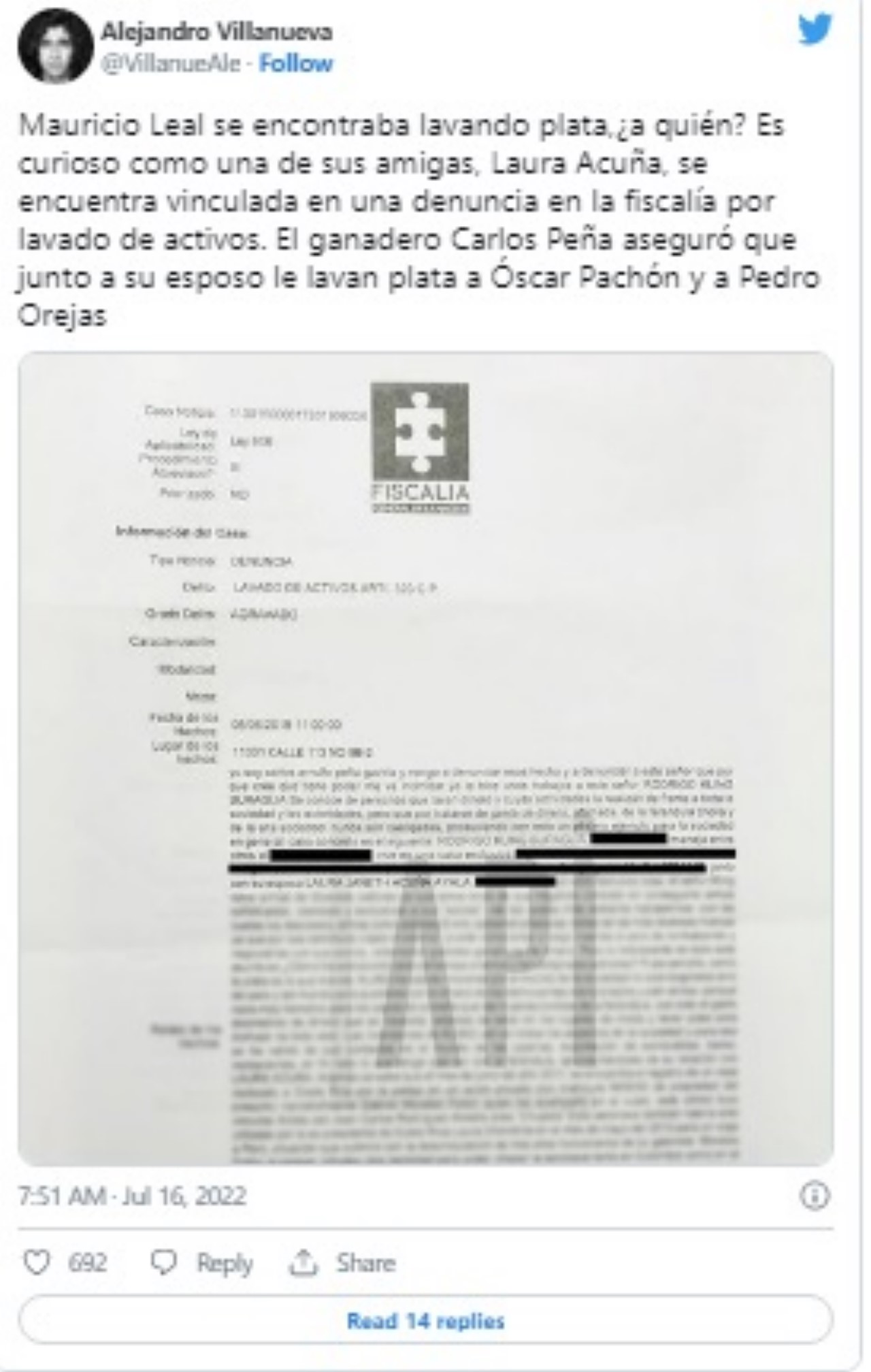 “Mauricio Leal se encontraba lavando plata, ¿a quién? Es curioso como una de sus amigas, Laura Acuña, se encuentra vinculada en una denuncia en la fiscalía por lavado de activos. El ganadero Carlos Peña aseguró que junto a su esposo le lavan plata a Óscar Pachón y a Pedro Orejas”, escribieron en un trino que acompañó con una imagen de la denuncia.