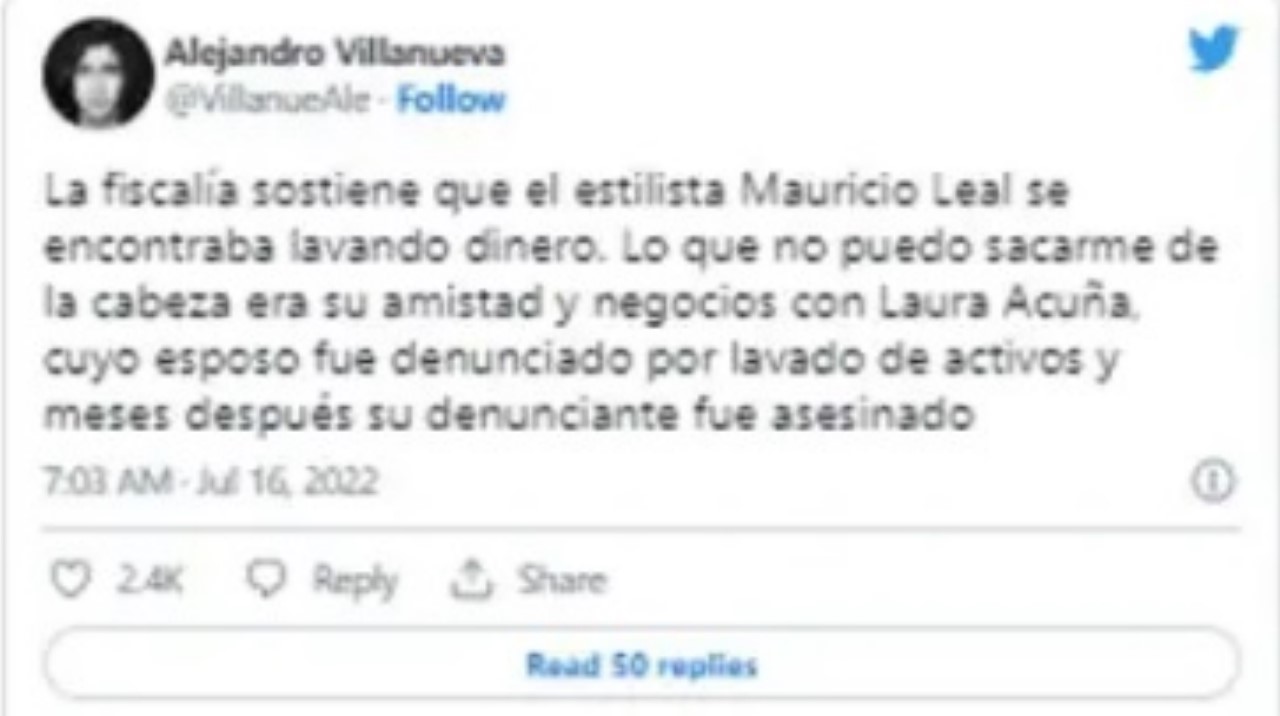 Luego de que la Fiscalía detallara que Leal habría tenido ingresos de dineros de dudosa procedencia, el columnista Alejandro Villanueva compartió una denuncia que le hicieron a Rodrigo Kling, esposo de Laura Acuña.