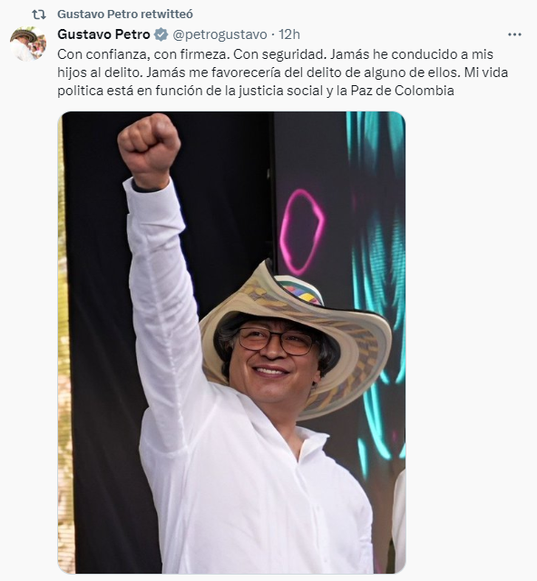 Junto a esto, el presidente de Colombia, compartió en sus redes sociales un mensaje diciendo que él jamás guió a sus hijos al camino del delito.