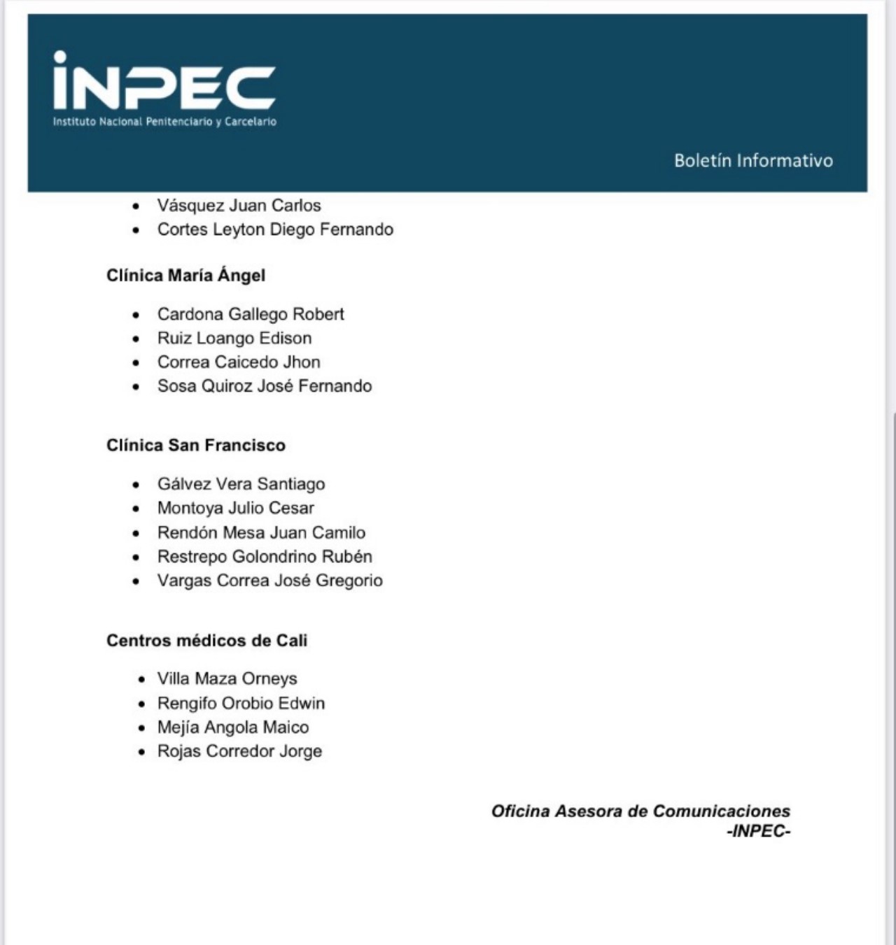 El Instituto Nacional Penitenciario y Carcelario – INPEC – dio a conocer el listado de los privados de la libertad del establecimiento de Tuluá que se encuentran identificados sin novedad y quienes se encuentran en centros de salud.