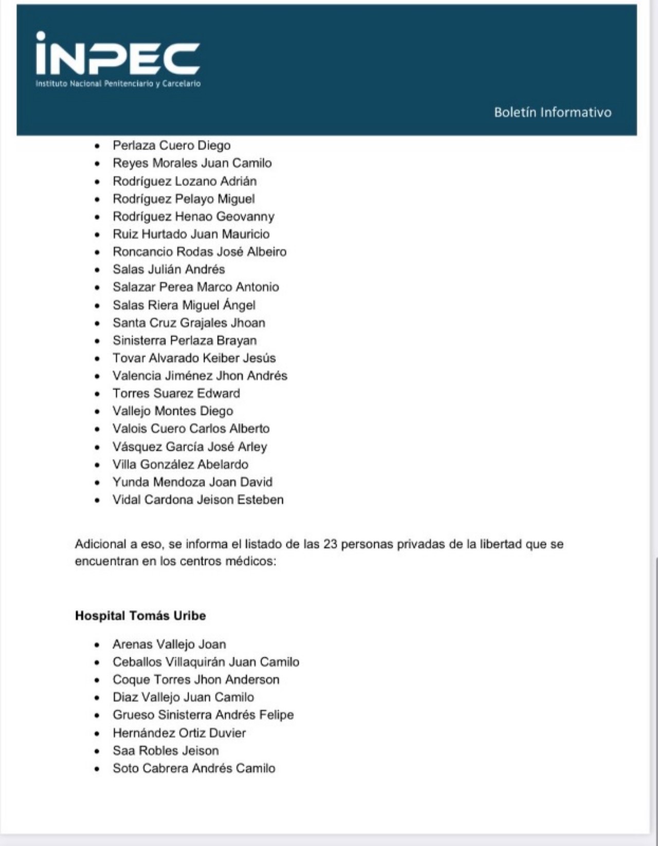 En horas de mañana del pasado martes 28 de junio, el coronel Wilson Román Silva Rodríguez, comandante operativo de Policía Valle, entregó el listado de privados de la libertad que resultaron ilesos luego del incendio al interior del pabellón 8 de la cárcel de Tuluá.