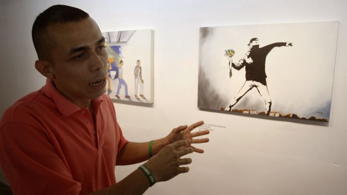 Hay algunos artistas nacientes como Marlon Cartagena, un hincha condenado a 33 años por el asesinato de un seguidor de Independiente Medellín, que apenas lleva un cuadro en su historial, pero que ha descubierto un talento oculto y que la paz “puede ser una obra de arte” con una pintura en la que el protagonista lanza flores e invita a no estigmatizar.