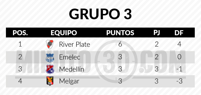 Por lo pronto, el escalafón lo lidera River Plate, con 6 puntos, seguido de Emelec, que al igual que el DIM, también tiene 3. Sin embargo, tanto los ecuatorianos como los argentinos, que se medirán este jueves entre sí, tiene un partido menos.