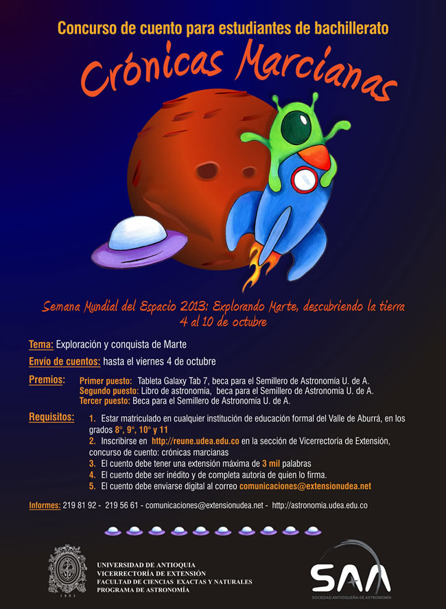 Con el Concurso de Cuento Crónicas Marcianas, para jóvenes estudiantes, el Programa de Astronomía y la Vicerrectoría de Extensión de la Universidad de Antioquia se unen a la celebración de la Semana Mundial del Espacio 2013 “Explorando Marte, descubriendo la tierra” del 4 al 10 de octubre.