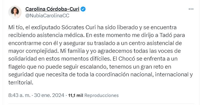 Carolina Córdoba Curi,  a través de su cuenta de X dijo que “mi tío, el exdiputado Sócrates Curi ha sido liberado y se encuentra recibiendo asistencia médica”.