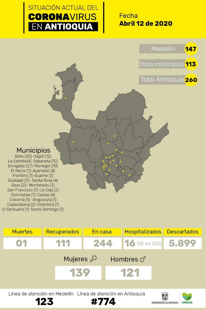El nuevo reporte de este domingo 12 de abril indica que el número de personas contagiadas por coronavirus en Antioquia se elevó a 260, contando con 7 nuevos casos registrados a nivel departamental.