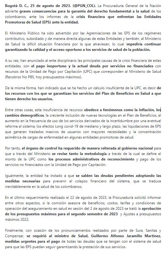 Recientemente, la Procuraduría informó sobre la queja de diversas Entidades Promotoras de Salud (EPS), las cuales advirtieron la complejidad de seguir prestando el servicio de salud a los colombianos, por el retraso en el pago de los servicios, así como la retribución correspondiente por el pago de la Unidad de Pago por Capitación (UPC), responsabilidad del Ministerio de Salud.