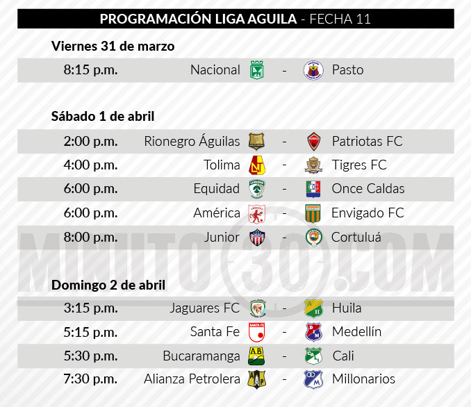 La programación se extenderá hasta el próximo domingo 2 de abril, cuando Independiente Medellín visitará a Santa Fe, en el Estadio El Campín, en partido programado para las 5:15 p.m.