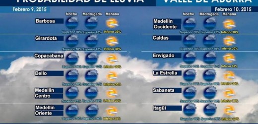 Minuto30.com .- El pronóstico del Tiempo 24/7 para Medellín y el Area Metropolitana, para la mañana del 10 de febrero se espera una probabilidad de lluvias inferior al 30%.