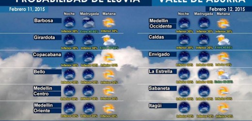 Minuto30.com .- El pronóstico del Tiempo 24/7 para Medellín y el Area Metropolitana, para mañana se espera una probabilidad de lluvias inferior al 30%, entre las 6:00 a.m. y 12:0 p.m. a excepción de Girardota, La Estrella y Caldas que tendrían un 40%- 60% de probabilidad de lluvias.
