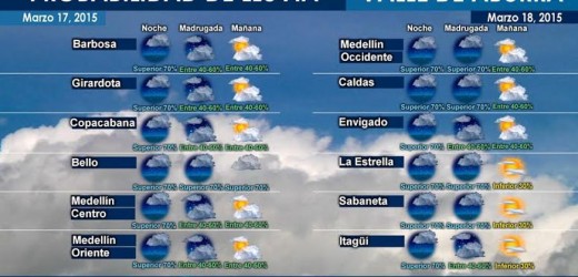 Minuto30.com .- El pronóstico del Tiempo 24/7 para Medellín y el Area Metropolitana, para mañana 18 de marzo de espera probabilidad del 40% al 60% en gran parte del Valle de Aburrá, Bello contaría con una probabilidad de lluvias superior al 70% y la Estrella, Itaguí y Sabaneta tendrían por el contrario una probabilidad inferior al 30%