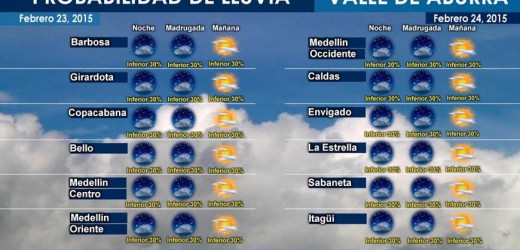 Minuto30.com .- El pronóstico del Tiempo 24/7 para Medellín y el Area Metropolitana, para el día de mañana 24 de febrero se espera probabilidad de lluvias inferior al 30%.