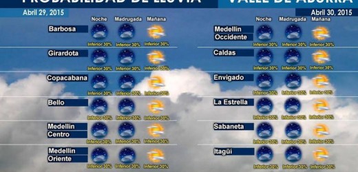 Minuto30.com .- Según pronóstico del Tiempo 24/7 para Medellín y el Area Metropolitana, para mañana 30 de abril el Valle de Aburrá tendría una probabilidad inferior al 30% de que se presenten lluvias.