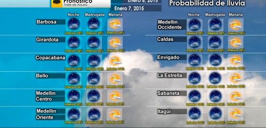 Minuto30.com .- El pronóstico del Tiempo 24/7 para Medellín y el Area Metropolitana, para esta noche indica una probabilidad de lluvias en la sub región que no supera el 30%. Este mismo pronóstico aplica para el día de mañana.